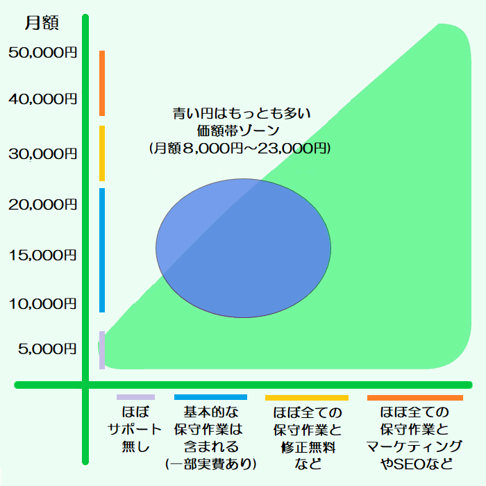 ■上記のイメージグラフは縦軸が月額の保守料金、横軸が保守サポート内容の充実度になっています。